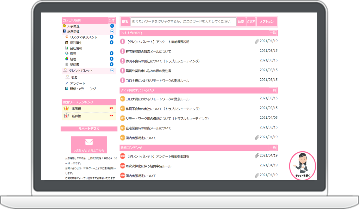 FAQトップページでは、ナレッジコンテンツを自動推奨しスムーズな検索を支援します。また、検索の際には求めている回答に辿り着けるよう、関連語をサジェストします。これらの機能はパソコンだけではなくタブレット、スマートフォンにも対応していますので、従業員はどこでも人事制度に関する疑問を解決することが可能です。