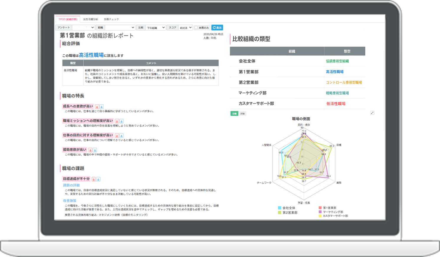 全社員を対象にした診断サーベイから、独自の組織診断ロジックを用い、組織の風土や状態を診断組織結果に対して、改善点をレポーティングする機能や組織状態グラフで表示し、経営やマネジメントの組織改善を支援します。