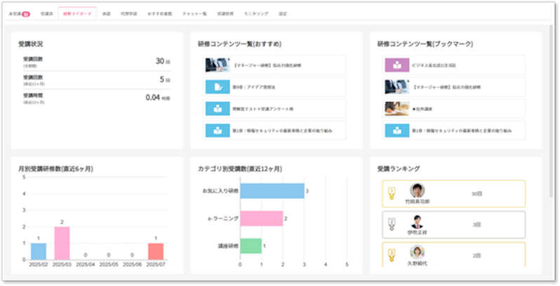 研修マイボード機能は、個人の学習進捗や社内での人気研修コンテンツをひと目で把握できる、いわば「学びのダッシュボード」です。