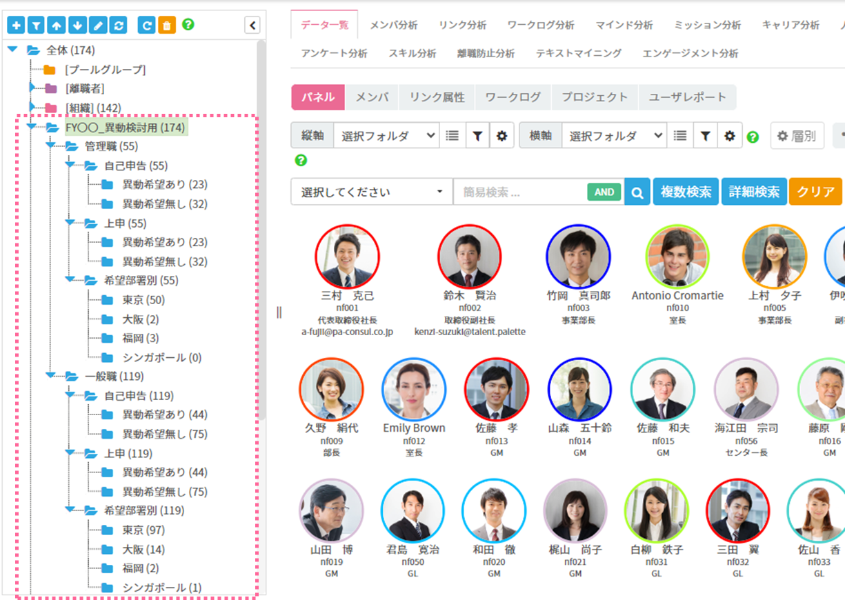 この際に作成するフラグ種別はポスト別、異動事由別、希望部署別、優先度別といったように、各社様によって様々なパターンがございます。モニタリングのフォルダは階層構造にすることができますので、ぜひ管理しやすい階層構造を作ってみてください。