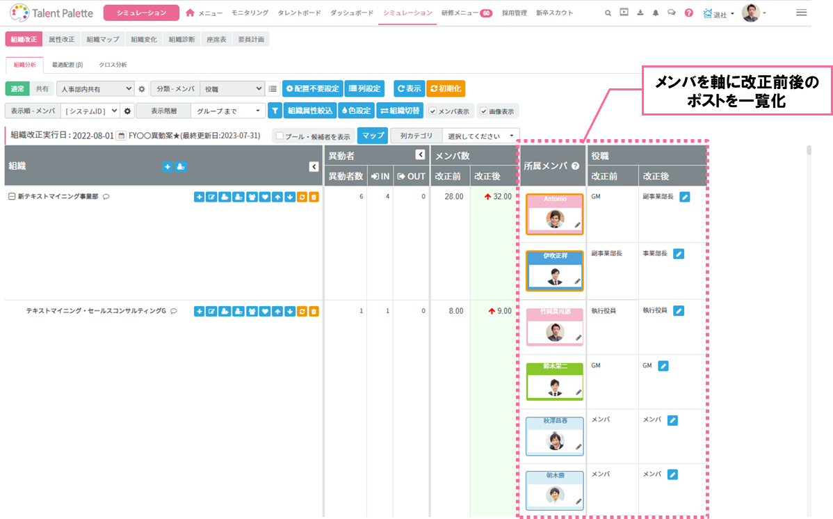 この画面では組織ごとのポジションを軸に改正前後のメンバーを把握することができます。