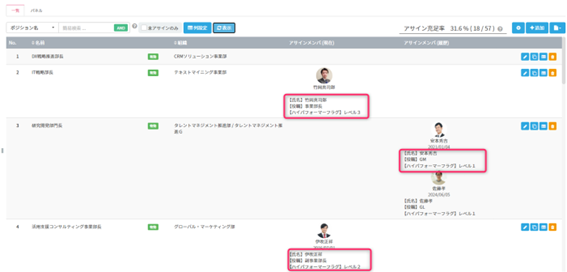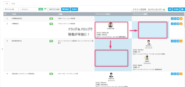 今回のバージョンアップで、ポジション管理>一覧で、メンバの顔写真をドラッグ&ドロップで移動できるようになりました。