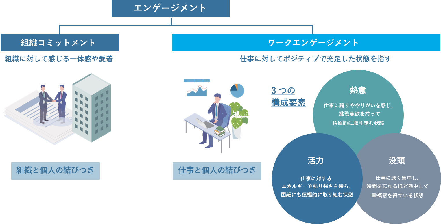エンゲージメントは大きく「組織コミットメント」と「ワークエンゲージメント」の 2 つに分類されます。