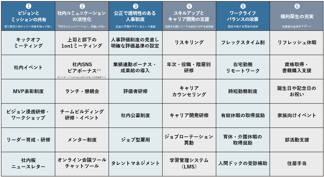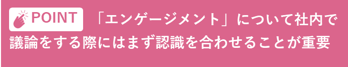 従業員エンゲージメントを高める要因とその方法は「100 社あれば 100 通り」です。自社にあった施策を実行することが重要です。