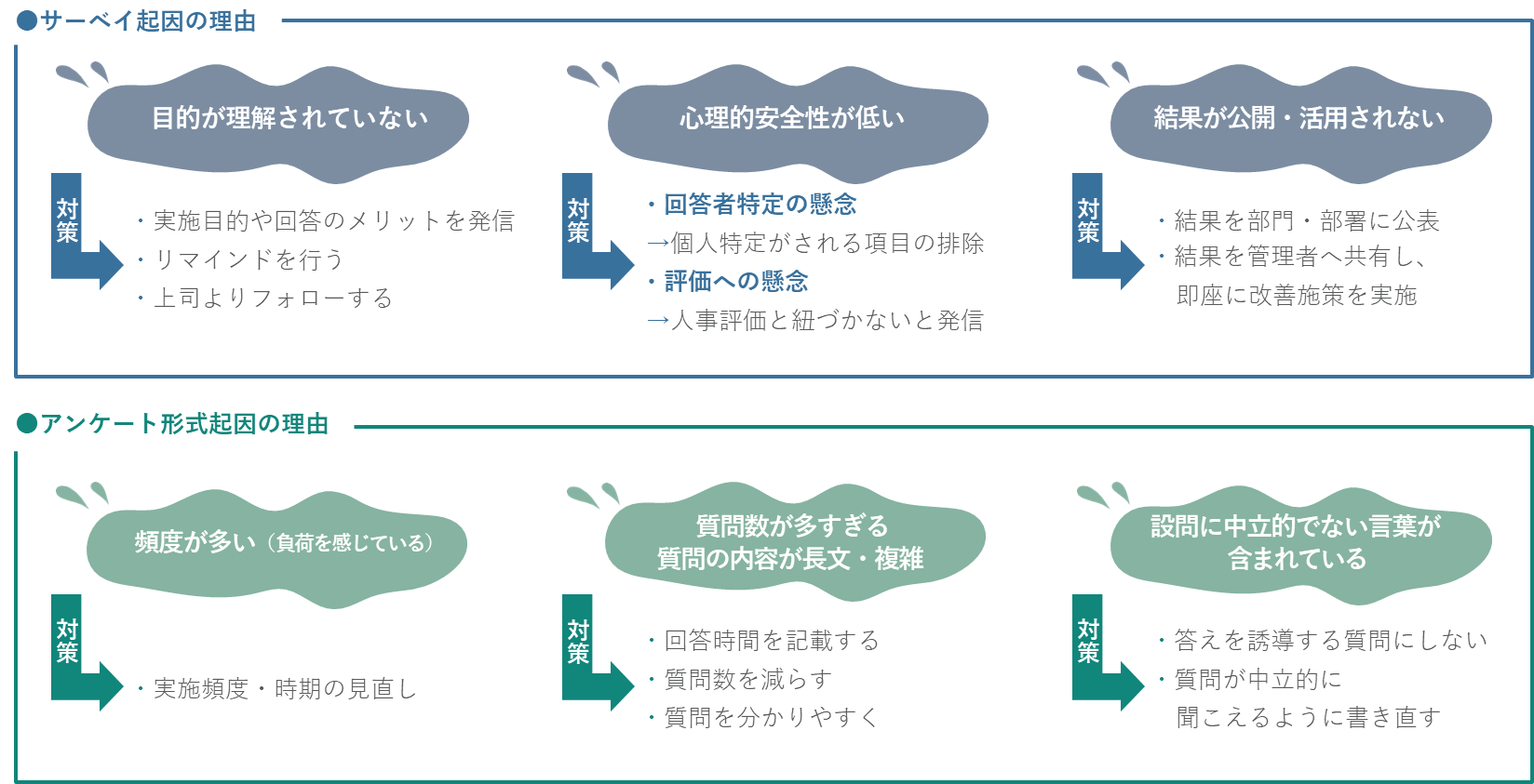 社員が回答してくれない理由はサーベイ起因とアンケート形式起因の 2 つにわかれます。