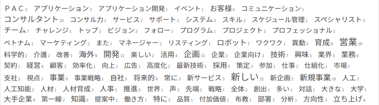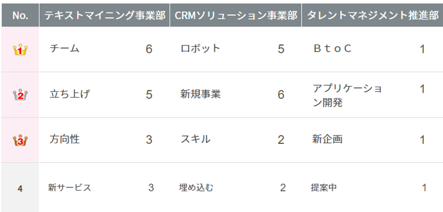 『新しい』『営業』という言葉が多く使われていることが分かり、社員の興味のある範囲を絞り込むことが出来ます。