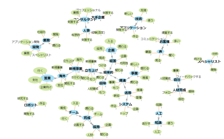 もちろん単語を閲覧するだけではなく、クリックすれば単語マップという単語間の流れも確認することが可能です。例えば中心の『新しい』という単語から右上の『事業』という言葉へ繋がっていることが分かります。