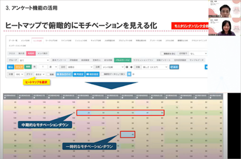 第1部ではタレントパレットのアンケートの作成方法をご紹介しました。実はタレントパレット内には9つものアンケートのテンプレートがあり、活用すればすぐに社員満足度調査やパルスサーベイのデータを収集できます。弊社人事部でも社員満足度調査やパルスサーベイのテンプレートを利用しており、その分析例を交えて紹介をしました。