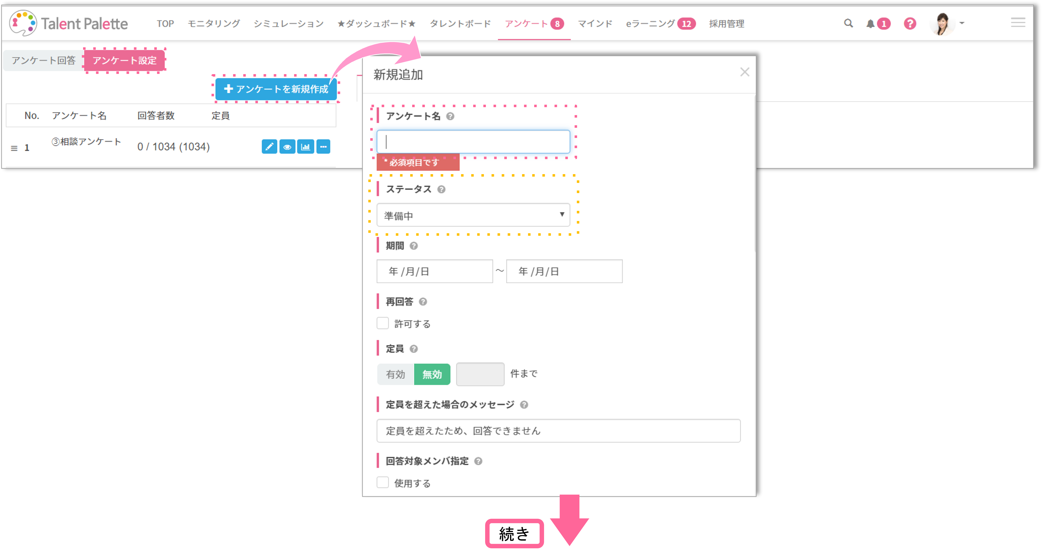タレントパレットのアンケート設定ではあらかじめテンプレートが用意されています。