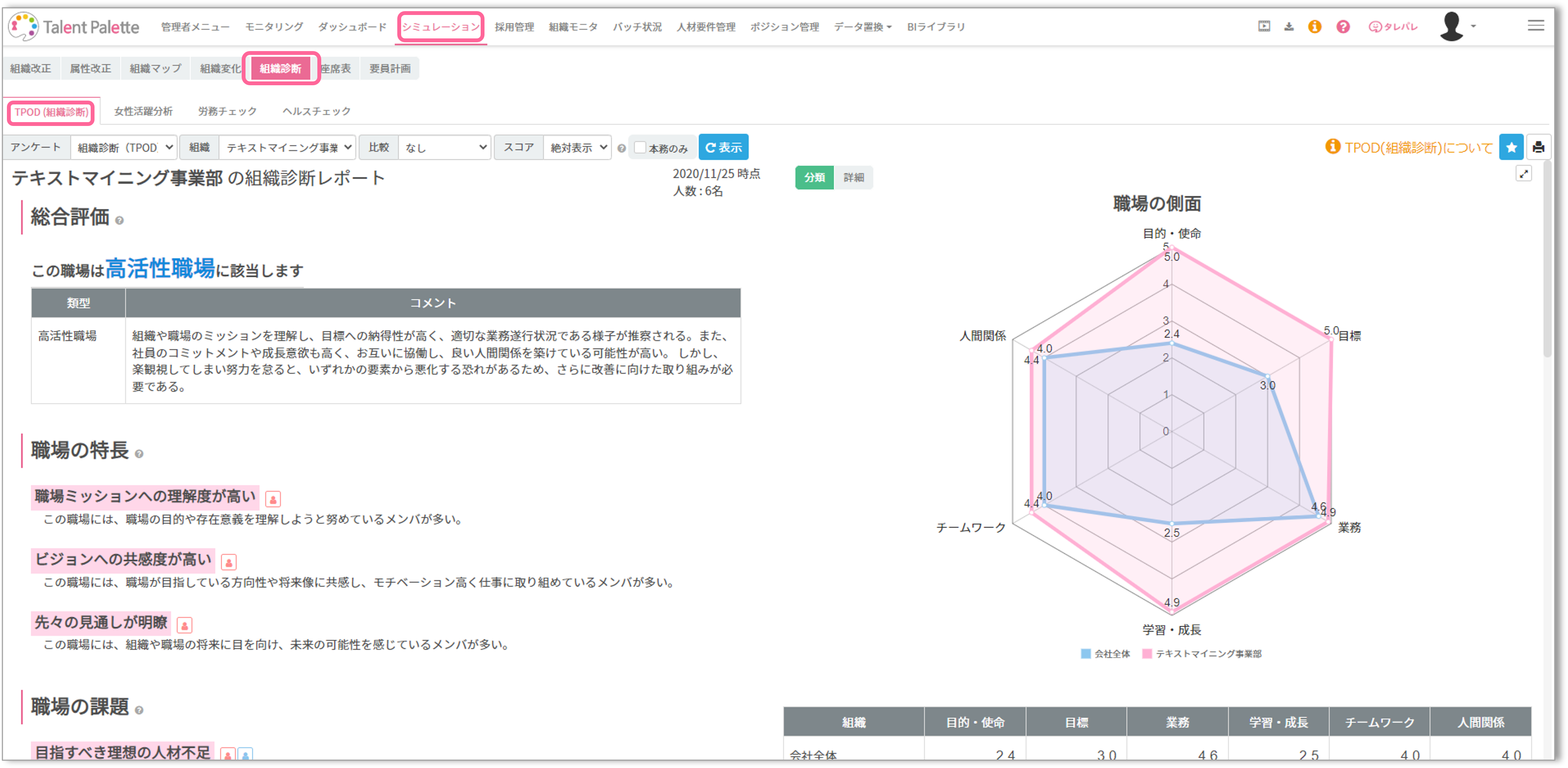 回答データは「シミュレーション>組織診断>TPOD(組織診断)」から確認できます。