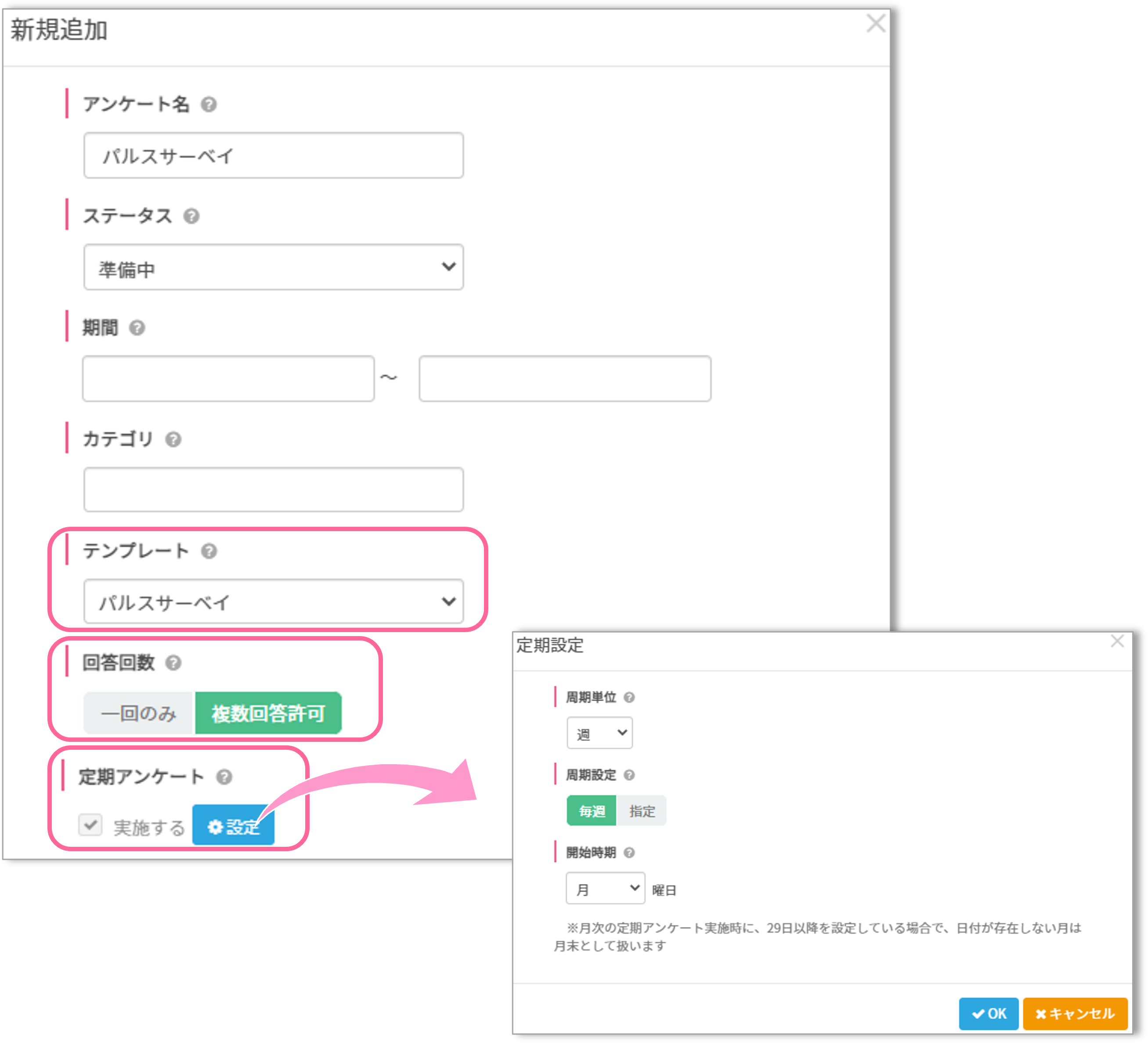今回の例ではテンプレートで「パルスサーベイ」を使用します。回答回数は定期で行うため、複数回答許可に設定しておきましょう。