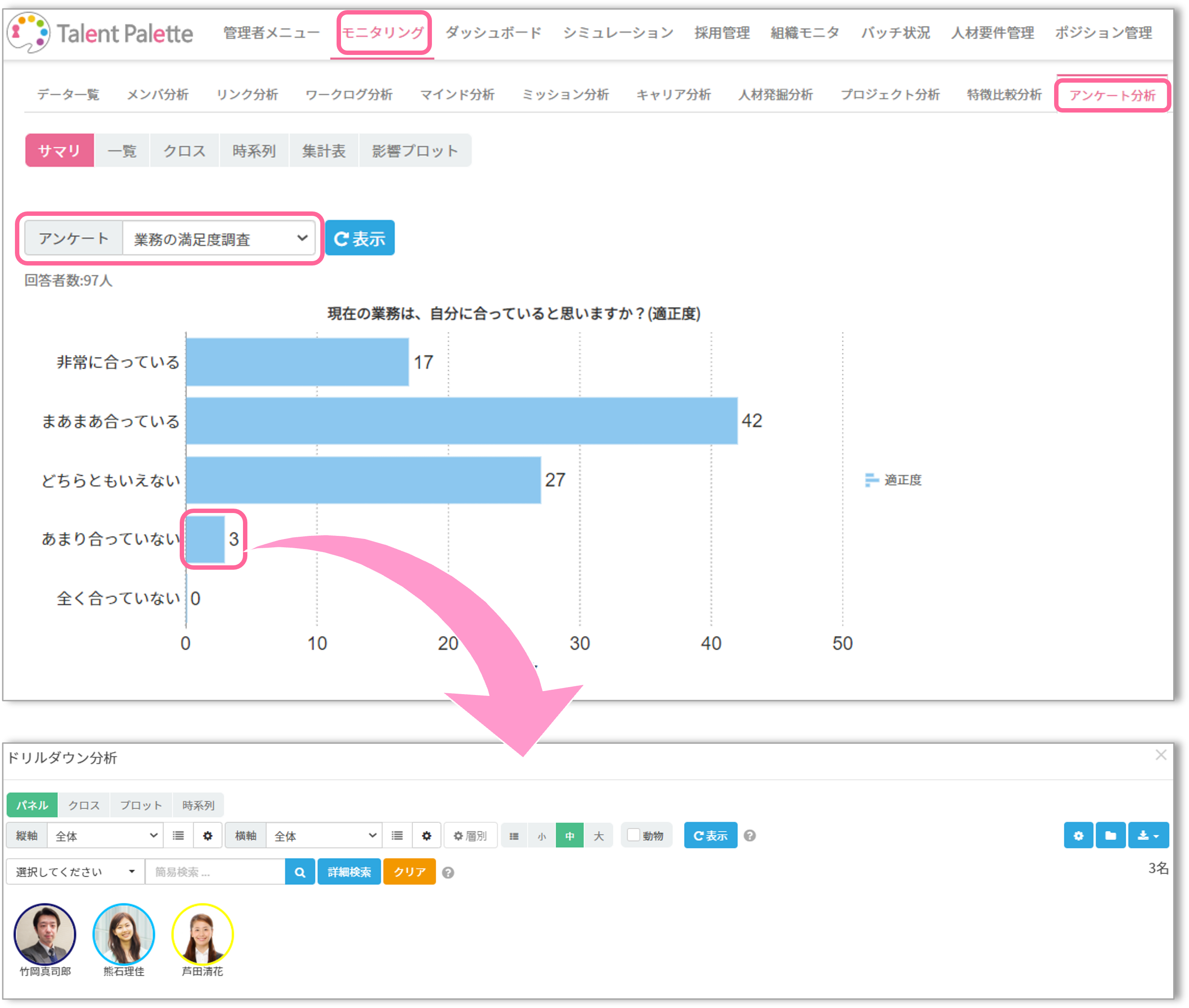 「あまり合っていない」と答えたところをクリックすると誰が回答したか(ドリルダウン分析)を確認することが出来ます。