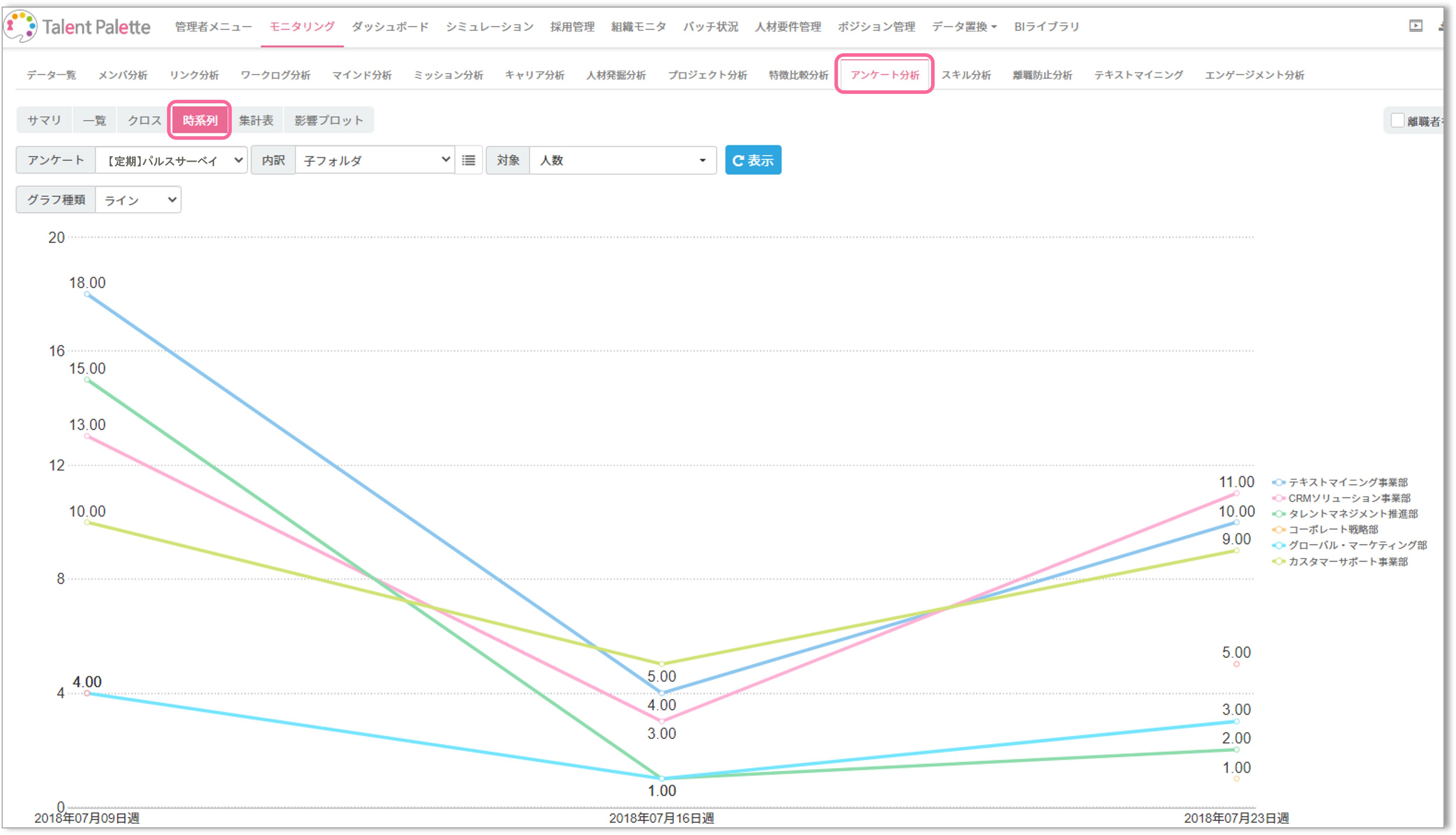 このアンケ―トを定期的に行うと、「モニタリング>アンケ―ト分析>時系列」で蓄積されたデータを時系列で確認することが可能です。