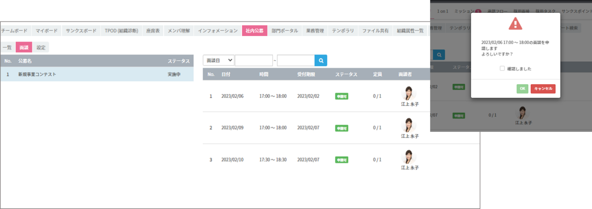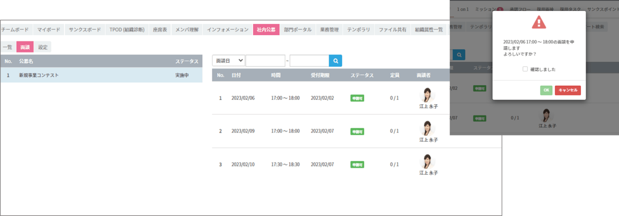 【メンバ】社内公募>面談タブから希望する日時を選択し申請 (申請可能な日時のみ出てきます)