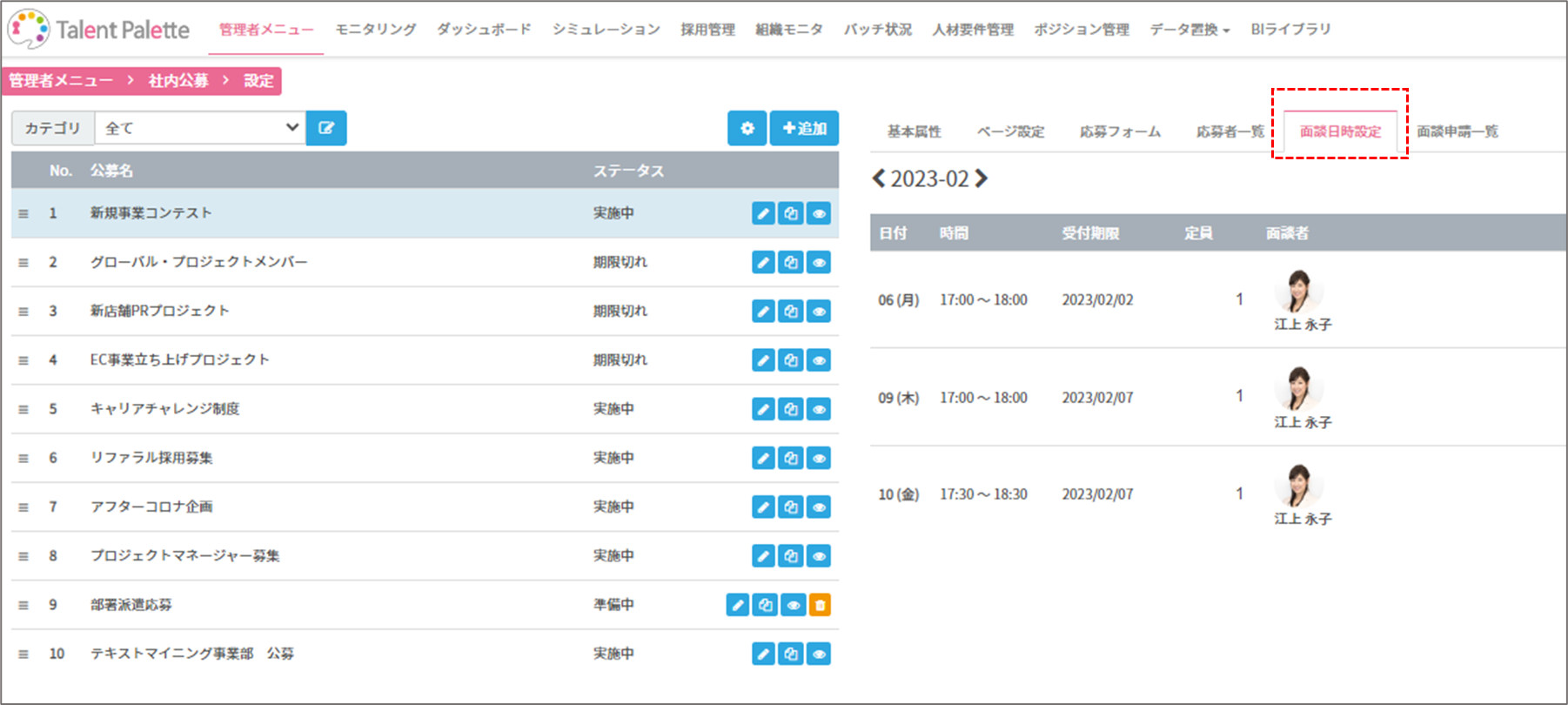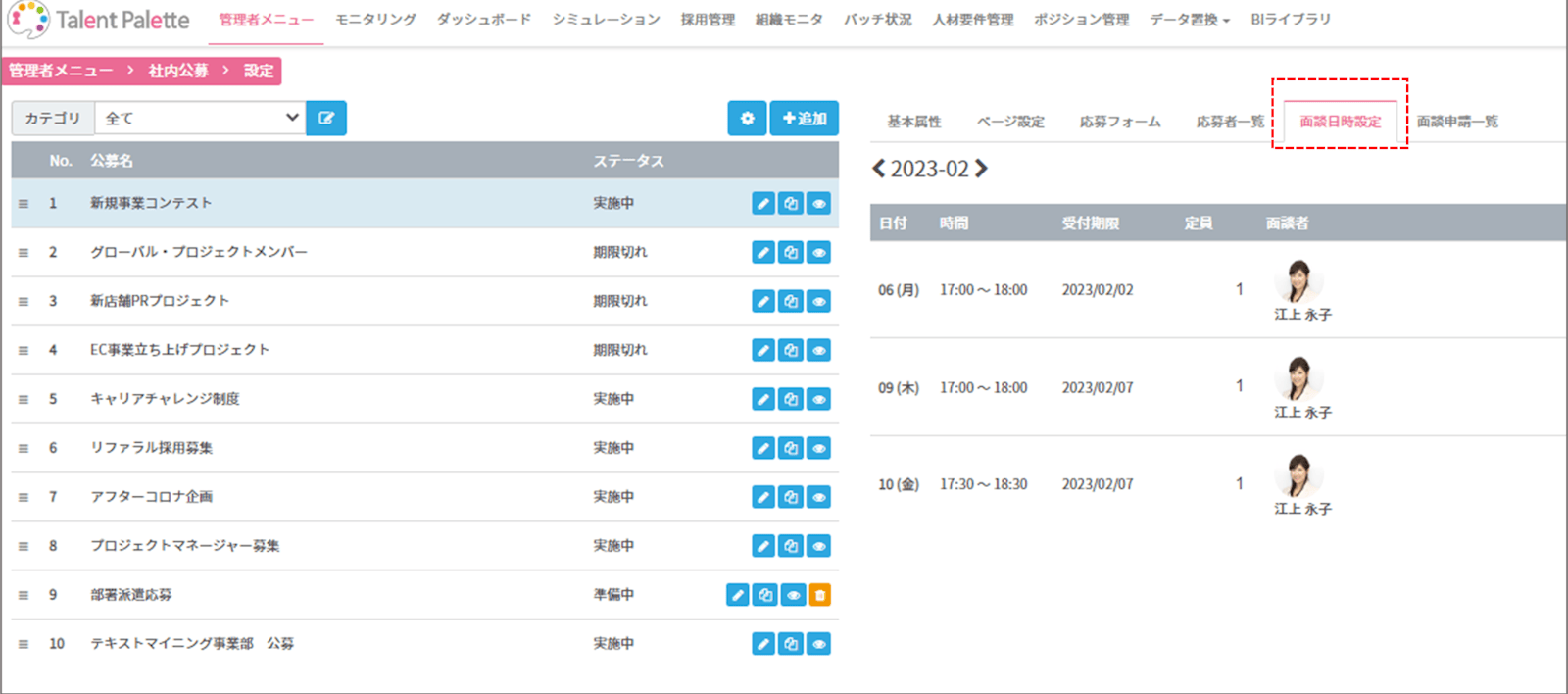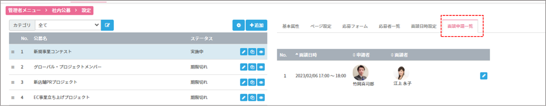 【管理者/設定者】設定>面談申請一覧 から申請内容と状況を見ることができます