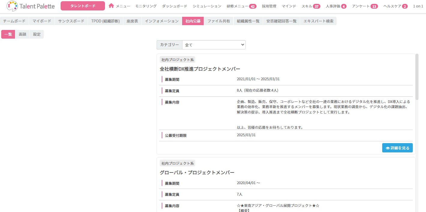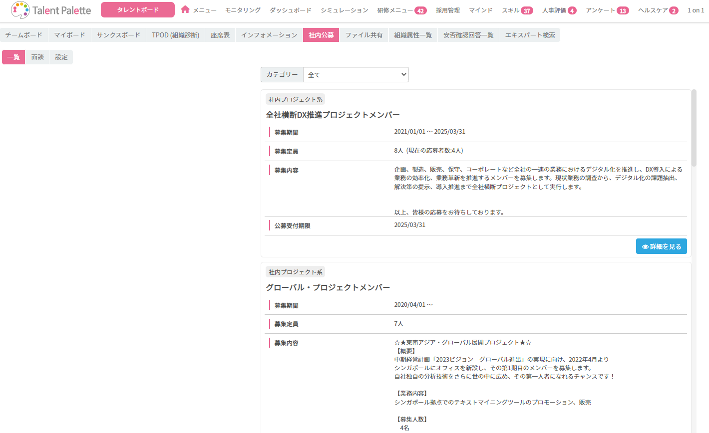 社内公募とは新プロジェクトや企画の要件を公開し社内で募集することができる機能です。