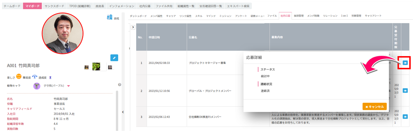 過去に応募した公募の選考状況などをメンバ実感モニタから確認できるようになりました。