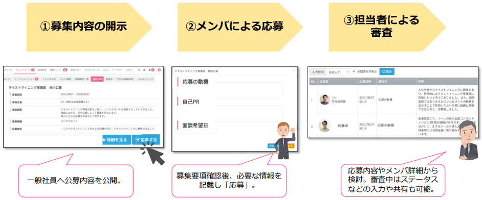 まず「社内公募」とは、会社からのさまざまな「募集」を開示し社員が応募、その管理までを一貫して行うことができる機能です。