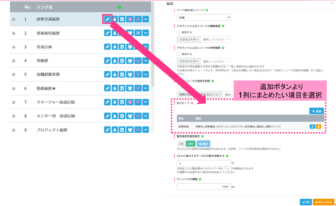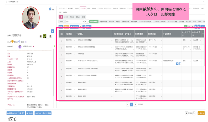 リンク属性には研修受講履歴や異動履歴など主に履歴情報を登録しますが、項目数が多くなると横に長くなり、