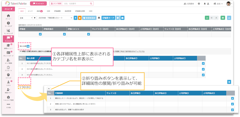 なんと、ミッションにおいて、詳細属性カテゴリ名の非表示と、詳細属性の開閉が可能になりました!!