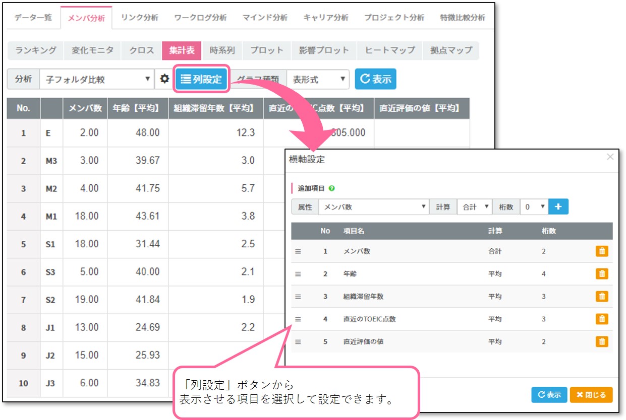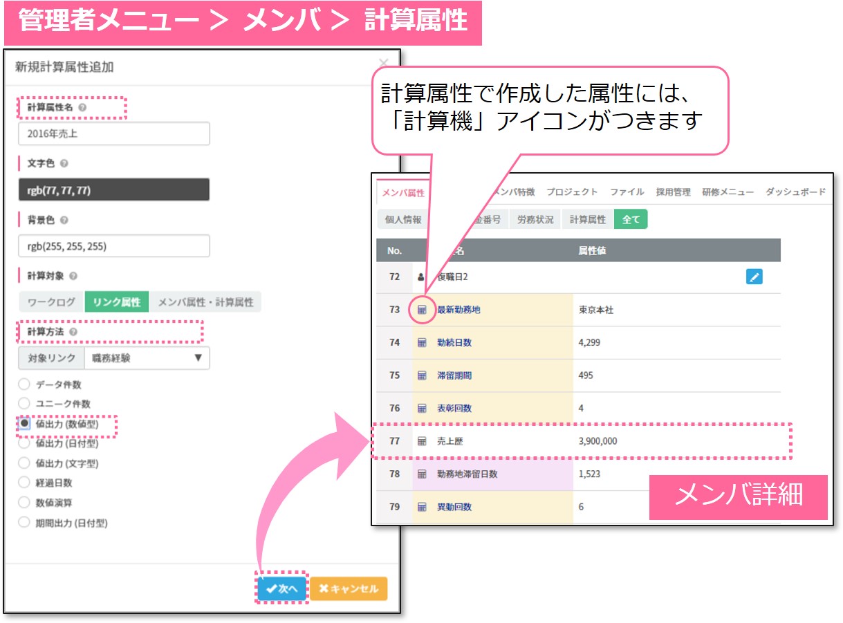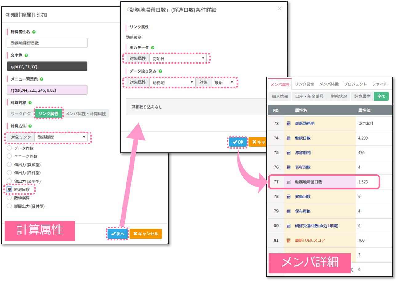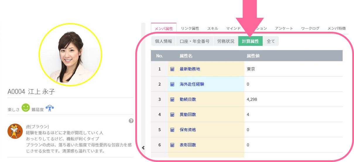 計算属性によって直近の評価を算出したり、 部署異動があってからの滞留年数などを抽出することができます。