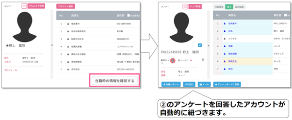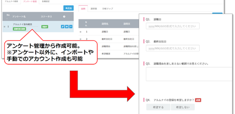 ②専用の意向確認アンケートに回答することでアルムナイアカウントの自動生成が可能