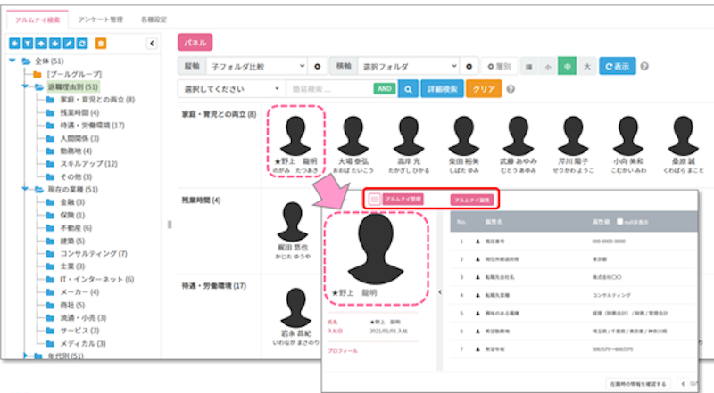 ①アルムナイ専用アカウントを作成し、情報管理・検索が可能