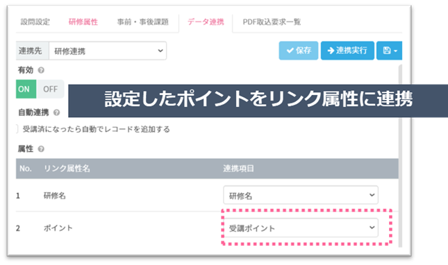 また、研修設定>データ連携より「受講ポイント」をリンク属性に連携することができ、