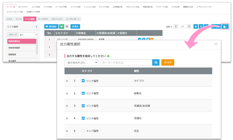 まずリンク属性についてですが、データ一覧からリンク属性を出力する際に