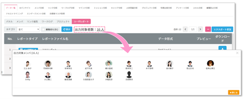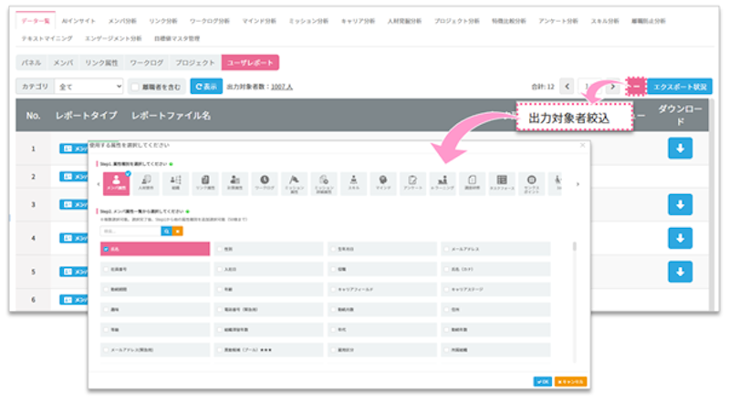 欲しい情報のみ出力ができたり、対象者を絞ってユーザーレポートの出力ができるようになりました。