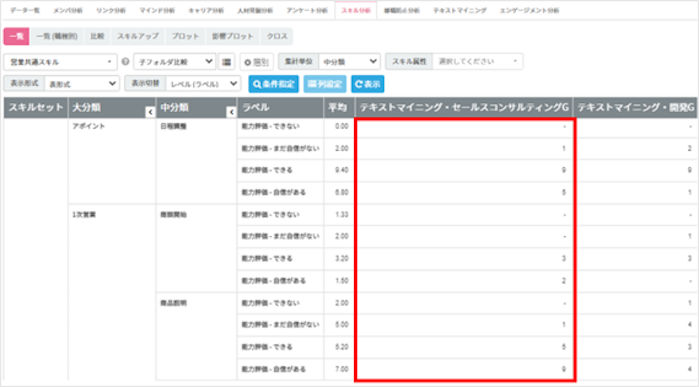 これまで各スキル単位でレベル(出来る、出来ない等)の回答人数を集計することができましたが、