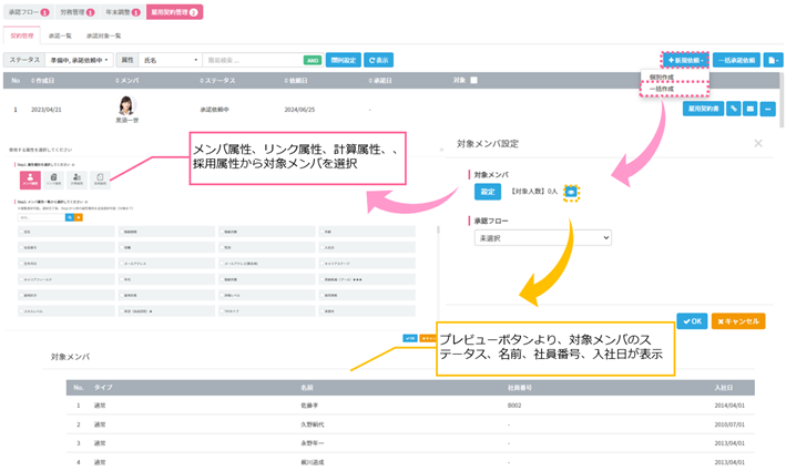 雇用契約書の作成の際、メンバ属性を条件に対象者を設定し、一括で雇用契約書の作成が可能となりました。