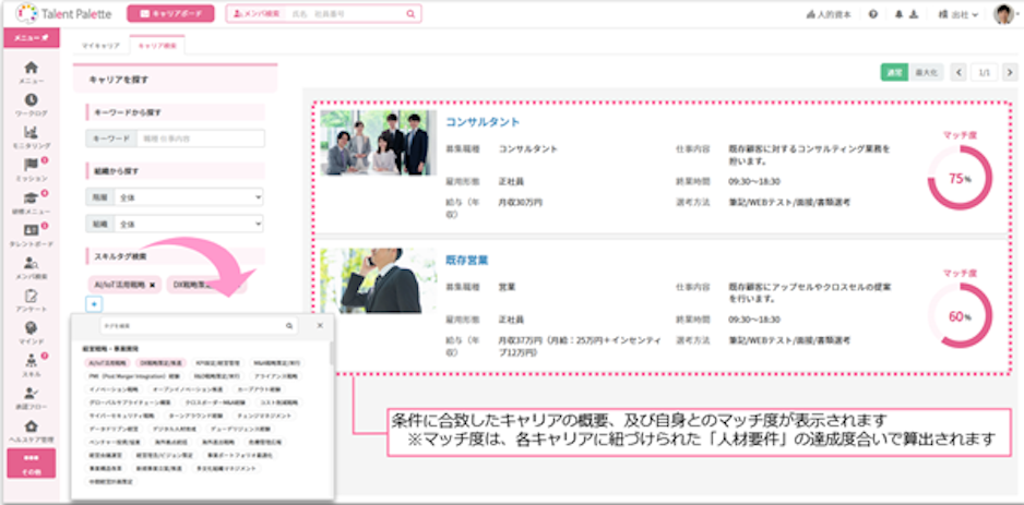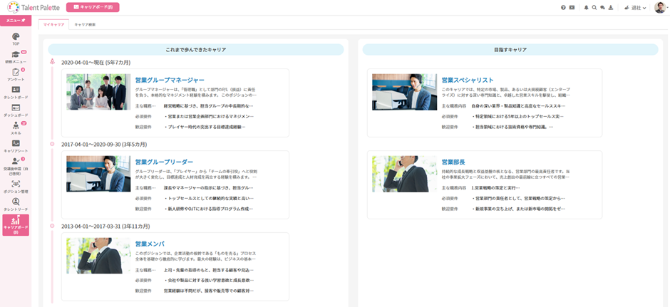 キャリアボードを利用することで、社内業務が可視化され、社員自らが目指したいキャリアを探すことができるようになります。