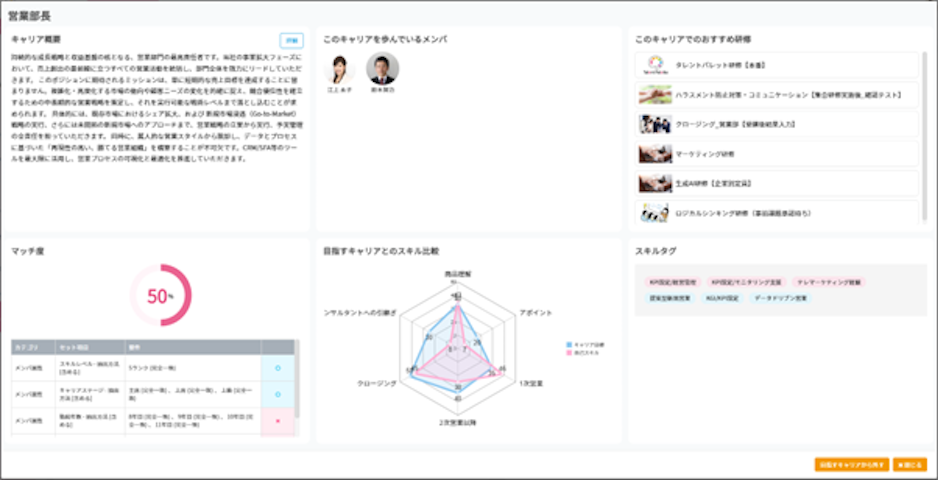 「目指すキャリア」に表示されている各キャリアを選択すると、キャリアの概要や自身とのマッチ度、キャリアに紐づく研修などが表示されます。