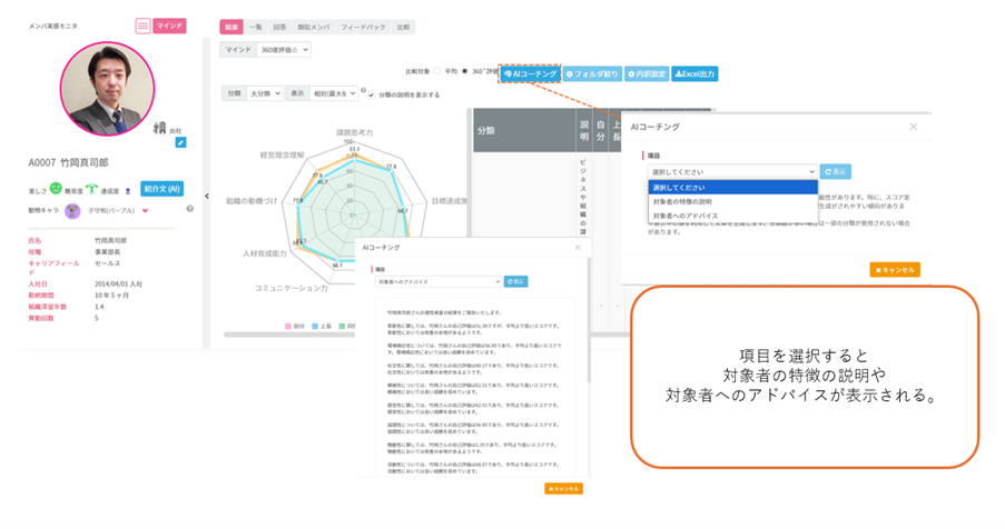 メンバ実感モニタからマインド>360度評価を選択し、AIコーチングを選択すると