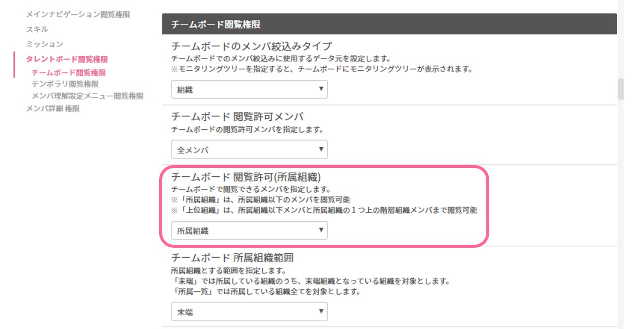 設定箇所:管理者メニュー>機能利用>タレントボード閲覧権限