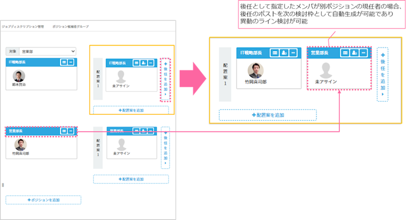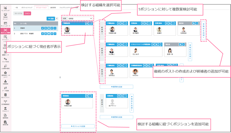 「玉突き人事」を表現したシミュレーションの形式で、ポジション同士につながりを持たせながら、配置案を検討することができる機能です!