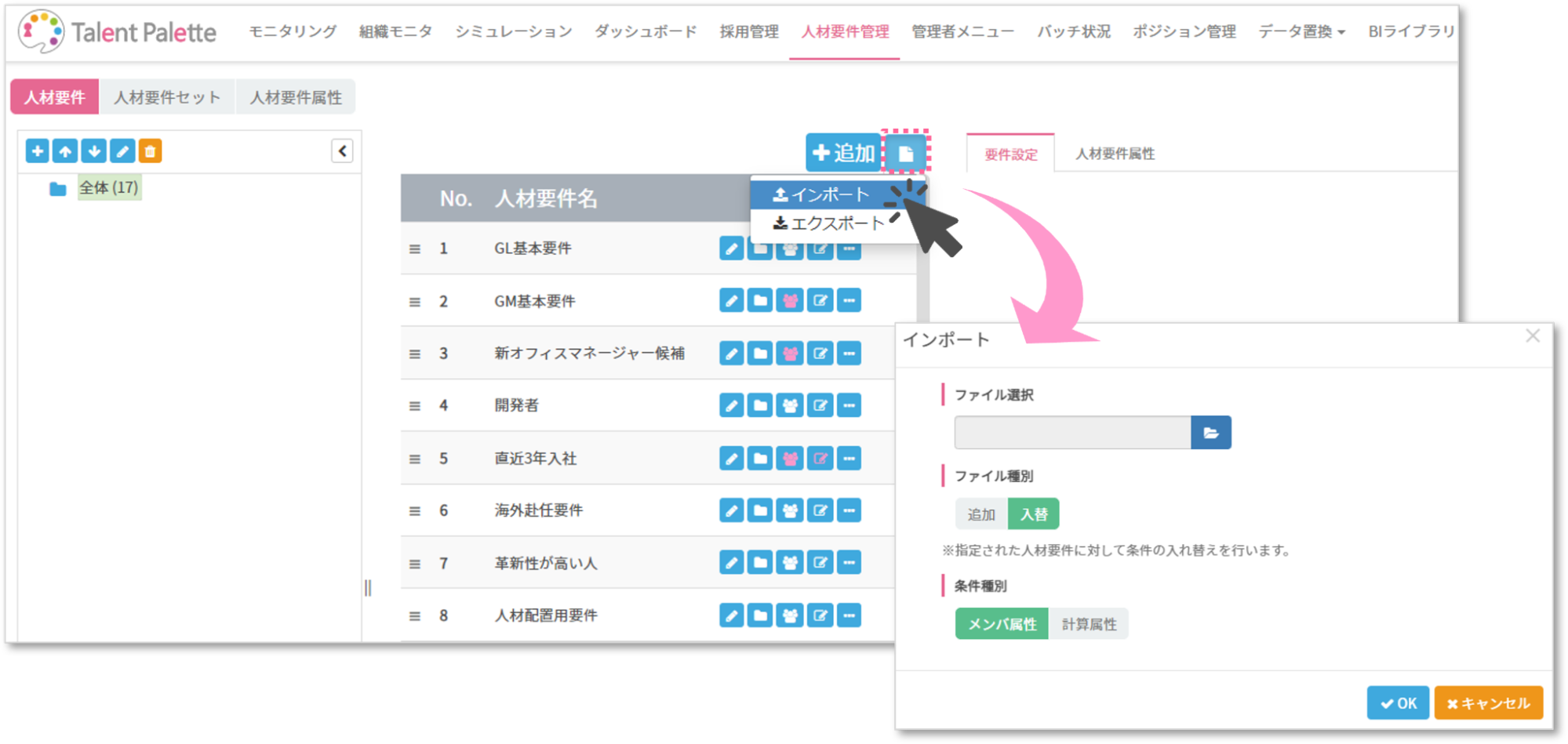 「ファイル種別」の「追加」は、インポートファイル上の条件を各人材要件に追加する際に使用し、