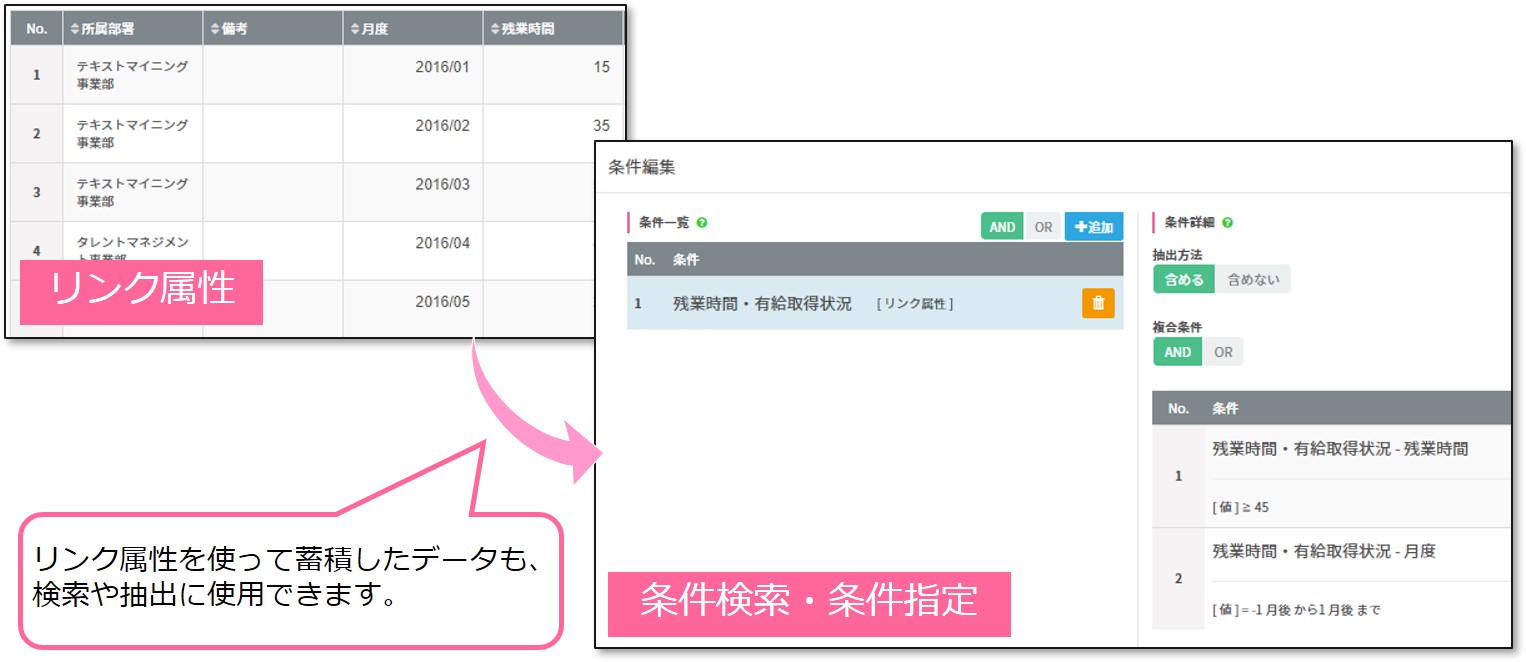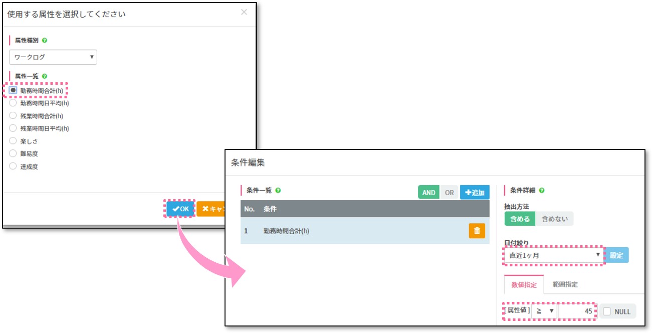 操作手順:条件設定に「ワークログ」の残業時間合計(h)が「45」以上