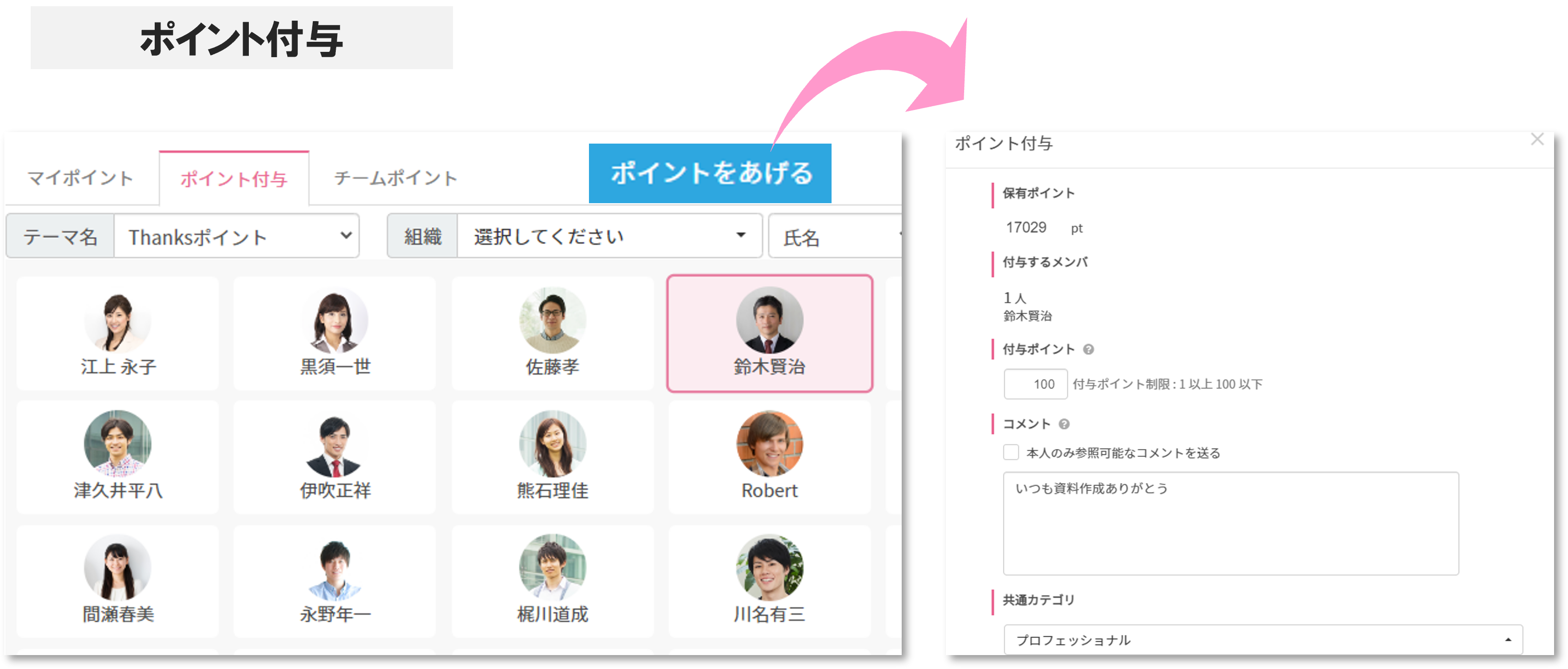 サンクスポイントは社員同士が日頃の感謝の気持ちを伝えることができる機能です。また、サンクスポイント獲得時には相手のコメントに対してお返しコメントをつけることもできます。そのため、日常的に感謝の気持ちを伝えたり、お返しコメントでやりとりをすることにより社員同士のコミュニケーションを活性化させることができます。 下図は、サンクスポイントの付与・獲得のイメージとなっております。