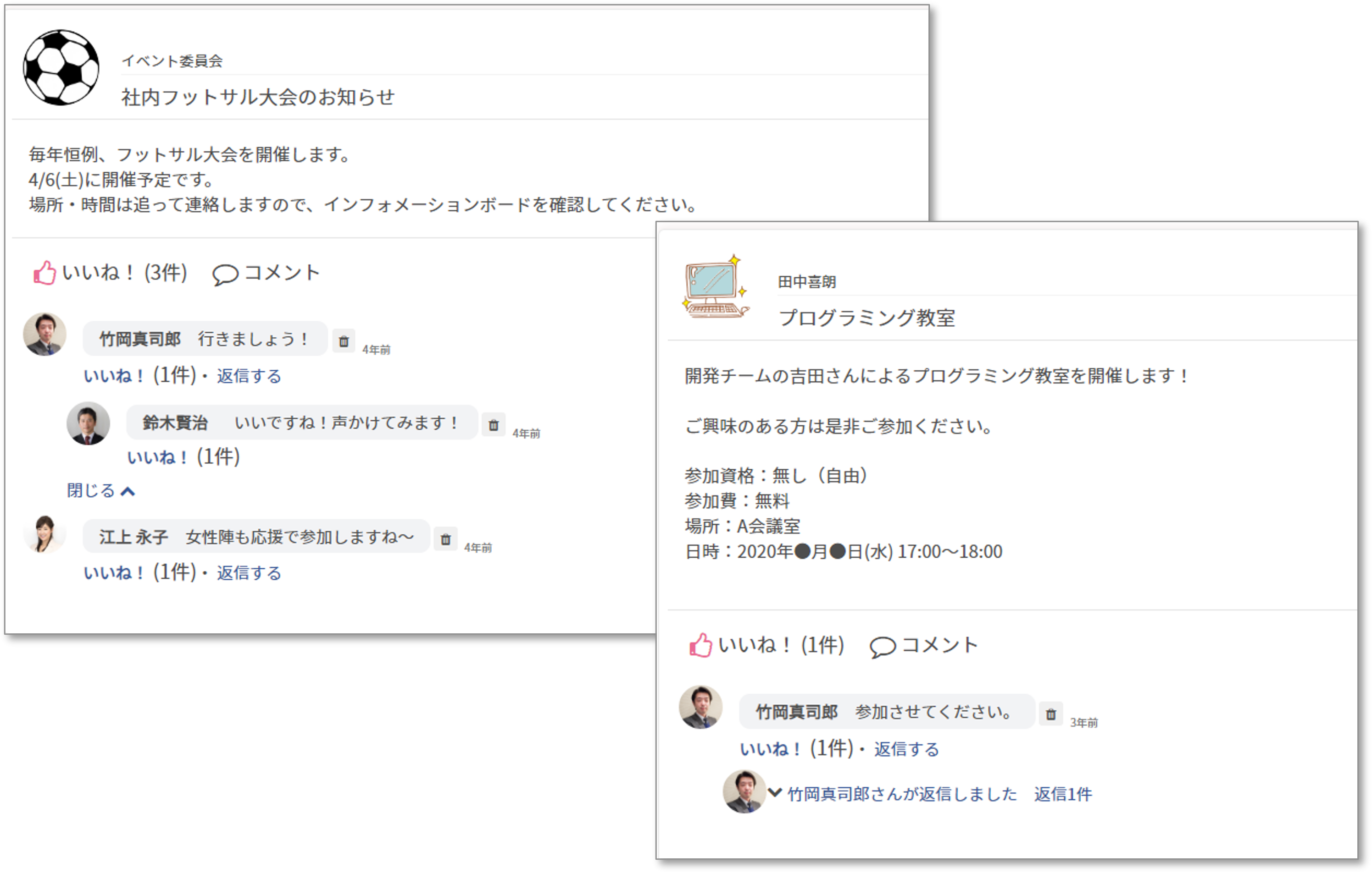 インフォメーションは掲示板のような機能です。 権限の設定次第では誰でも記事を投稿でき、記事に対してお互い”コメント”や”いいね”もできるため、タレントパレット上で社員の交流を深めることに役立ちます。