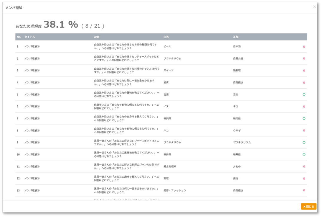 メンバ理解は、メンバの趣味や将来目指すものなどをクイズ形式で出題し、趣味や価値観・バックボーンを共有し、メンバの相互理解を深めたり、コミュニケーション向上に役立てるための機能です。社内イベントとの相性もよく、 社員同士の交流を活性化させます。すぐに利用できるテンプレートのご用意もありますが、 自社ならではの質問項目を作成し、より社内のコミュニケーションを活発にしている企業もいらっしゃいます。