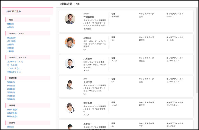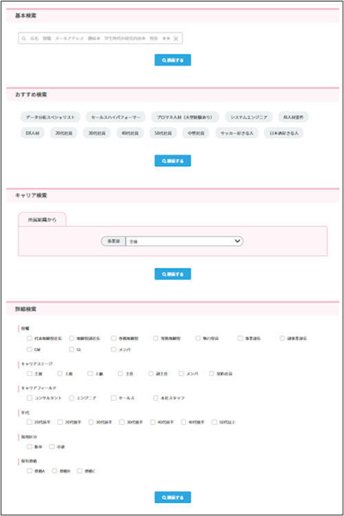 詳細な条件設定等不要でぱっと検索でき、経営層やマネジメント層に向けて人材発掘の検索に