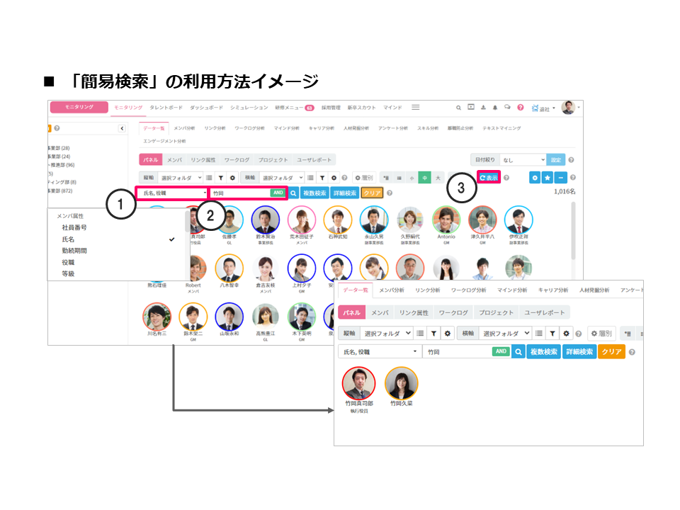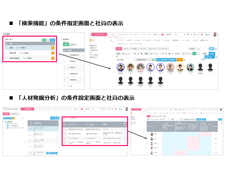 タレントパレットの基本の「検索機能」は直感的に使いやすいものが多いため、ユーザーの好みに合わせて使い分けいただければと思います。