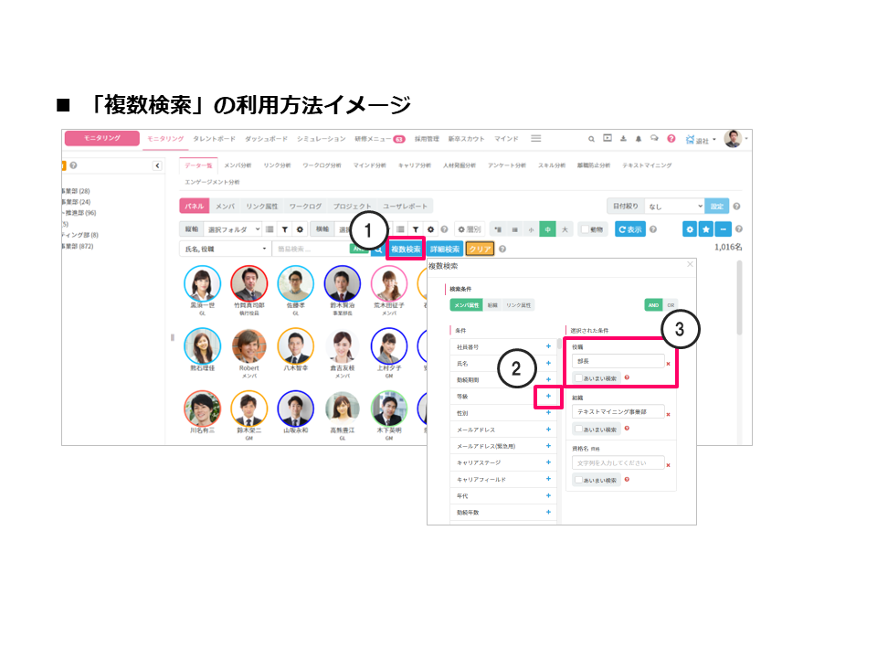 加えて、1部でも条件に合致している社員がいれば表示したいという考えがある際は、是非「人材発掘分析」をご利用いただき、